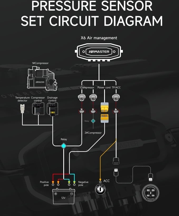 このエアサスマネジメントシステムの最大メリットは水抜き不要でシンプルなエアー配管と配線はカプラーオンによりエアー漏れトラブルをなくし配線接続ミスをなくしたインストールしやすいシステムです。